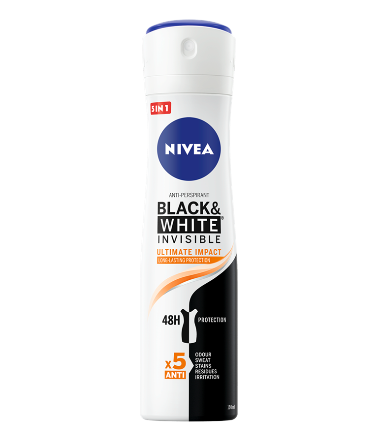 NIVEA Black & White "ULTIMATE IMPACT" aerosooldeodorand tagab usaldusväärse 48-tunnise töö. Higistamisvastane kaitse ja kokkupuute eelne kaitse x5 VASTU: lõhn, higistamine, plekid, jäägid ja ärritajad: lõhn, higi, plekid, jäägid ja ärritus.