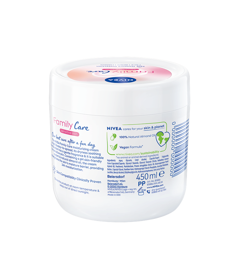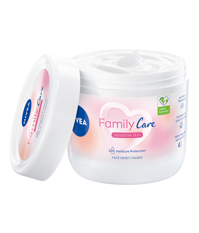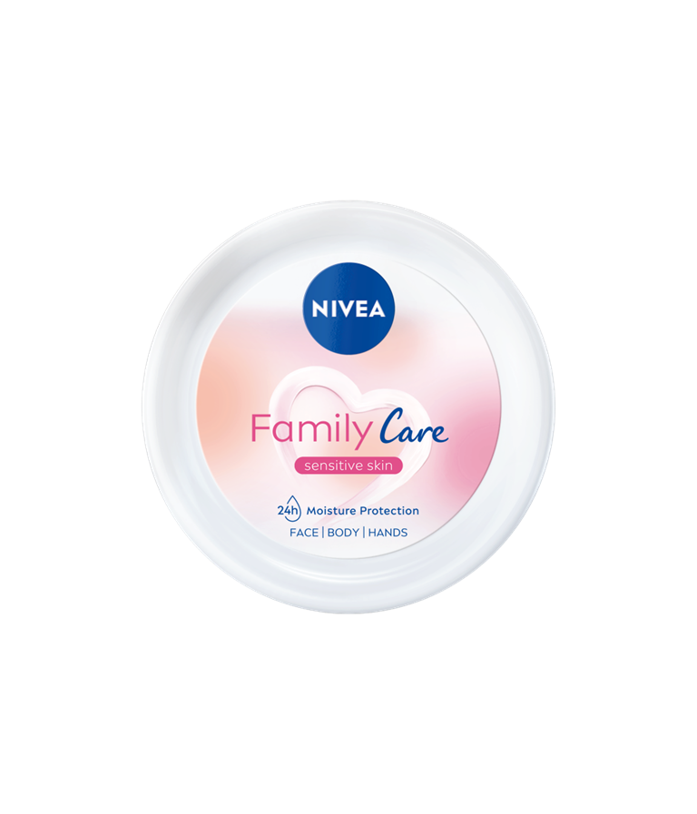 NIVEA FAMILY CARE kerge tekstuuriga näole, kehale ja kätele mõeldud niisutav kreem, mis sobib tervele perele.