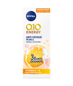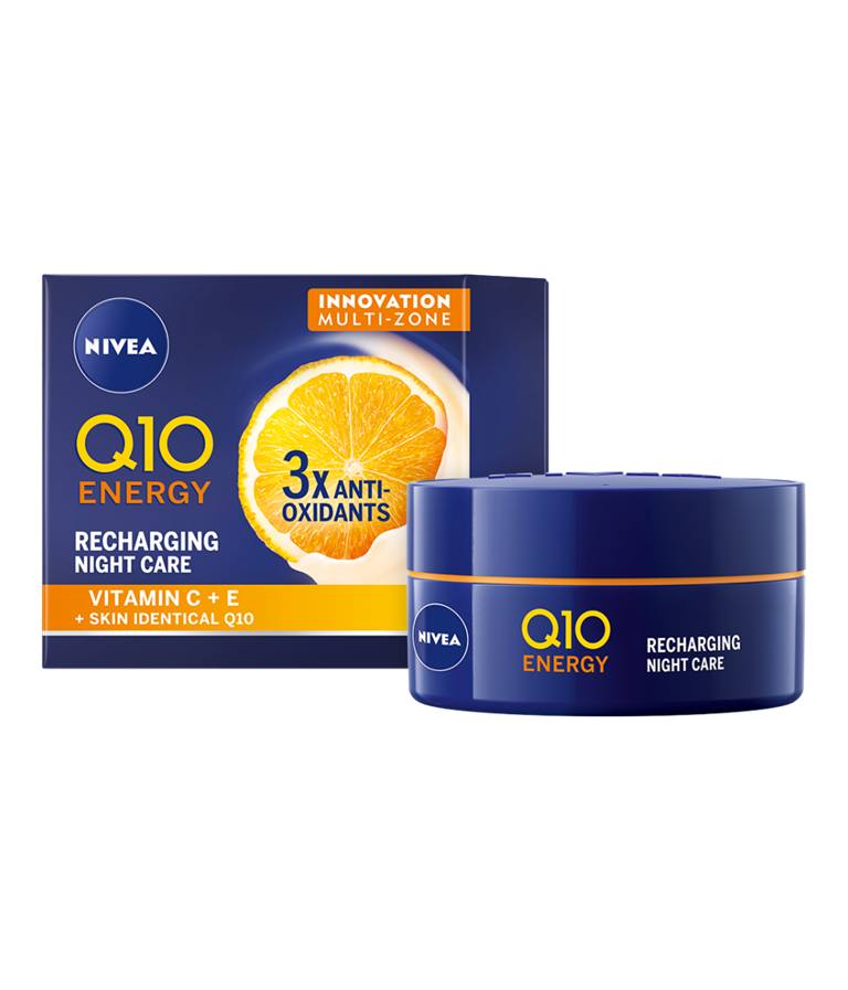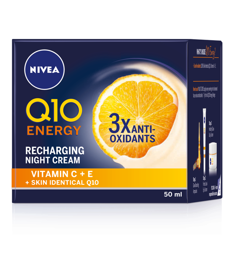 Aqua, Glycerin, Cetearyl Alcohol, Ethylhexyl Cocoate, Caprylic/Capric Triglyceride, Hydrogenated Coco-Glycerides, Butylene Glycol, Butyrospermum Parkii Butter, Glyceryl Stearate Citrate, Octyldodecanol, Ubiquinone, Sodium Ascorbyl Phosphate, Tocopheryl Acetate, Creatine, 1-Methylhydantoin-2-Imide, Ethylhexylglycerin, 1,2-Hexanediol, Carbomer, Sodium Hydroxide, Phenoxyethanol, Linalool, Limonene, Geraniol, Parfum, CI 16035NIVEA Q10 Energy Recharging Night Care provides you with more radiant skin and a NIVEA Q10 ENERGY ÖÖKREEM C-VITAMIINI, E-VITAMIINI JA KOEENSÜÜMIGA Q10 peente kortsudega tuhmile ja väsinud nahale. 3 ANTIOKSÜDANTI NAHA UUENEMINE Koostis, mis sisaldab kolme võimast antioksüdanti – C-vitamiini, E-vitamiini ja nahaga identset Q10, kaitseb nahka oksüdatiivse stressi ja vabade radikaalide moodustumise eest, aidates seeläbi parandada naha enda ainevahetust. See öökreem on mõeldud spetsiaalselt peente kortsudega väsinud ja tuhmile nahale. Omadused: 1. Aitab öösel lukustada niiskust nahka. 2. Tugevdab naha kaitsebarjääri. 3. Aitab võidelda stressitunnustega, nagu peened kortsud, tuhmus ja elujõu vähenemine. 4. Säravam ja tervema välimusega nahk kaheksa tunniga. 5. Nooruslikum ja rohkem pingul nahk kahe nädalaga. Kandke igal õhtul puhastatud näole, vältides otsest kokkupuudet silmadega. NAHATALUVUS DERMATOLOOGILISELT HEAKS KIIDETUD. *in vitro
