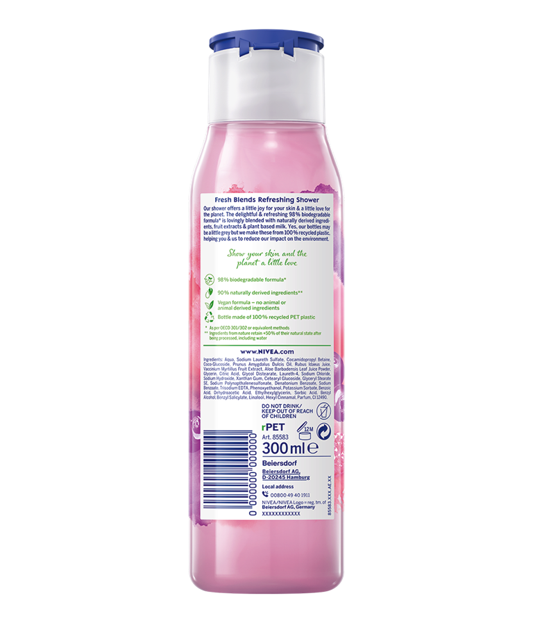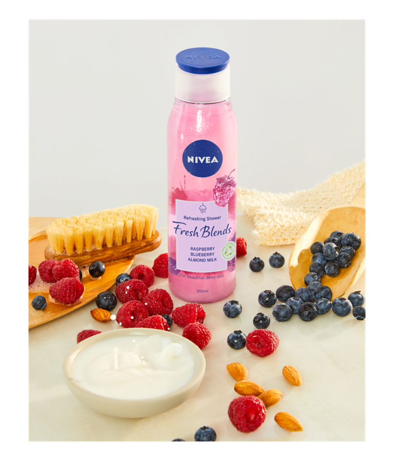 Proovige värskendavat dušigeeli FRESH BLENDS VAARIKA, MUSTIKA ja MANDLIPIIMA ekstraktidega.